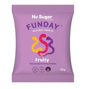 Funday’s Fruity Flavoured Gummy Snakes are sweet, chewy, and fun—perfect for satisfying a sweet craving. They’re sugar free, with no added sugar alcohols or artificial sweeteners. Toss them in your bag for a trip or mix with popcorn for that classic sweet-and-salty combo.