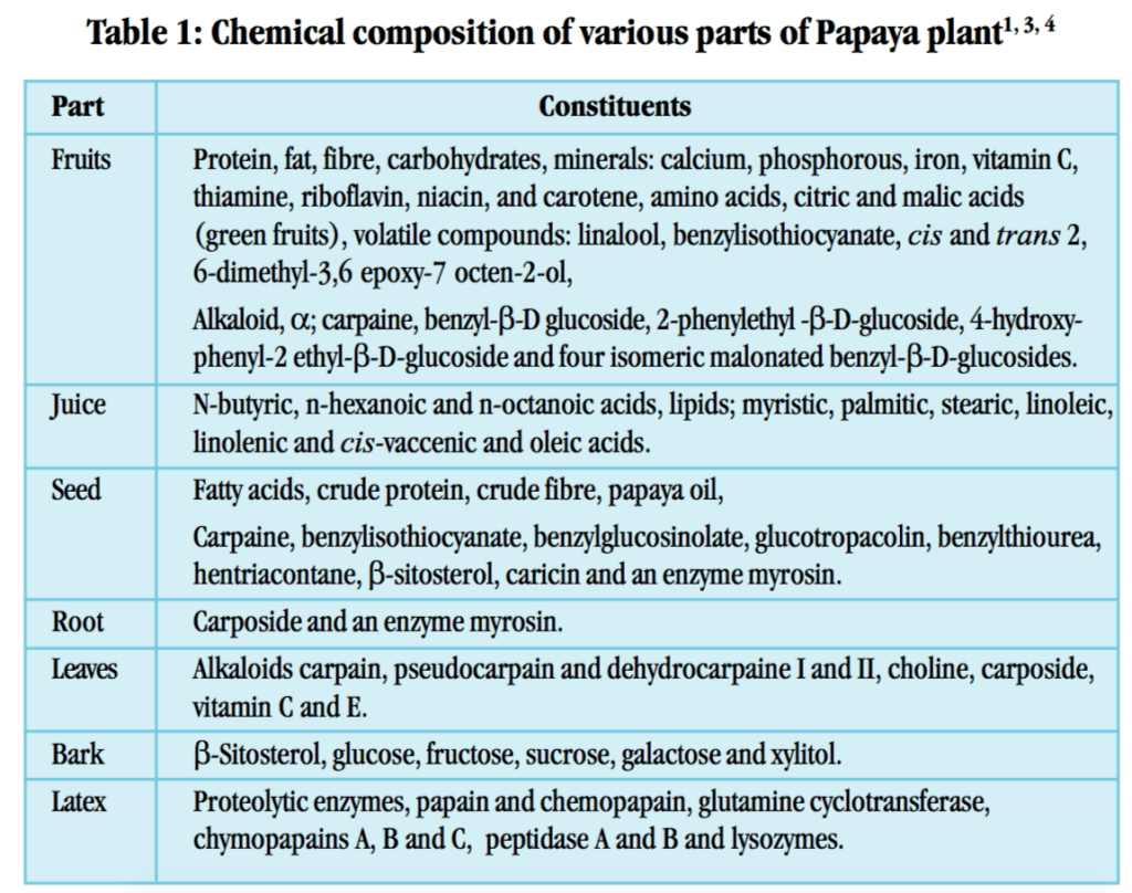 During the past few decades, a considerable amount of research has been done to illuminate the biological activity and medicinal applications of papaya. The table below summarises the chemical composition of papaya.