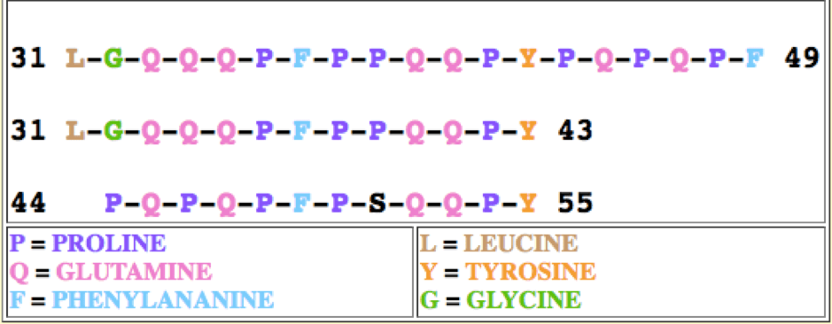 By far the most toxic fraction in the 53-amino acid sequence of gliadin is called Fraction 9, which has been shown to be unable to be digested by the intestinal mucosa of gluten-sensitive individuals. Usually, proteins are broken down into single amino acids that can be then utilised by the body- this breakdown is facilitated by digestive enzymes. However, in the case of gluten sensitive individuals, the body does not produce the enzymes to fully break down the amino acid chains, resulting in a group of gliadin peptides that are unable to be digested any further- as demonstrated in the diagram below.