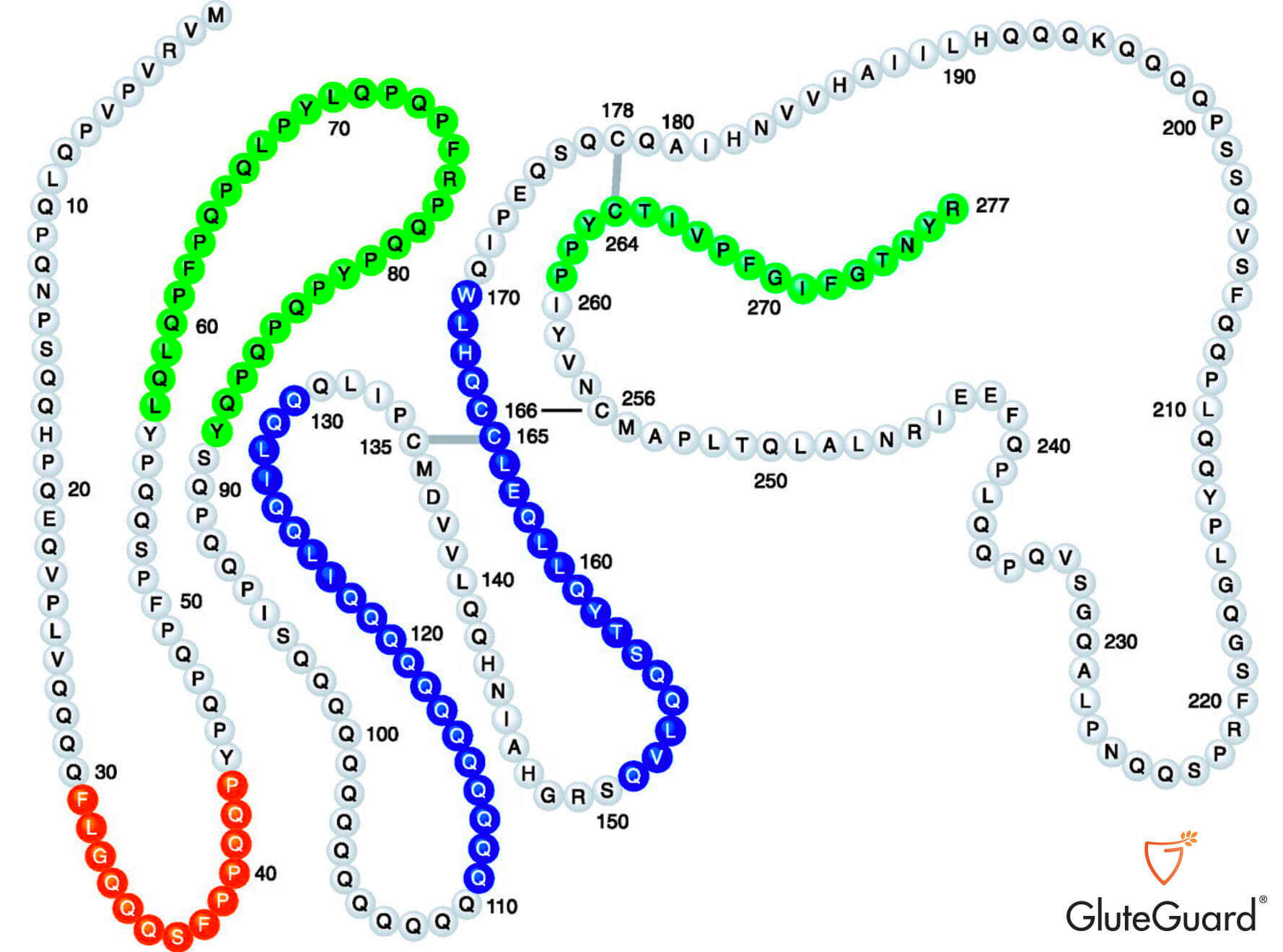 As shown in a 2011 study, different fragments of gliadin are responsible for different types of activity, and this is represented by the different colours in the diagram below: