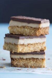 Meanwhile, make the caramel. Pour the coconut milk into a heavy-bottomed saucepan. Slowly bring to a boil. You may need to stir it constantly as it may spit and splutter. Reduce the heat to a low simmer, add the honey (or another sweetener), and cook for 30-45 minutes, stirring regularly, until thickened and reduced by one third to one half. Be careful not to burn the bottom as it will ruin the caramel. Once thickened, add the butter to the mixture and stir until completely melted. Pour into the tin and bake for 15 minutes until golden and bubbling (check out this video of what it should look like). Remove the tin from the oven and cool completely, before transferring to the fridge to chill.